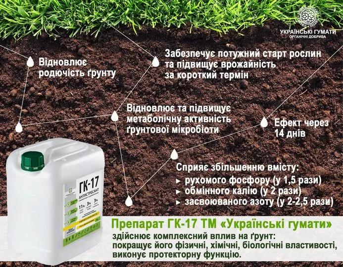 ГК-17 - це класичний препарат на основі гумату калію, що є потужним антистресантом з набором мікроелементів, який покращує родючість ґрунту