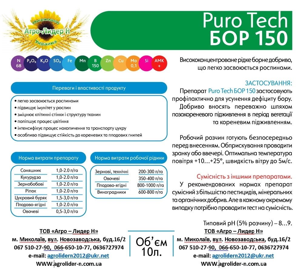 Рідке концентроване добриво на основі боретаноламіну з вмістом аміно- і гумінових кислот. Бор важливий елемент, який приймає участь у багатьох фізіолого-біохімічних процесах таких, як регуляція запилення, запліднення, вуглеводневий і білковий обмін, синтез і транспорт цукрі з листків в коренеплоди. Він також забезпечує ріс меристеми, вегетативних органів і коревої системи.
