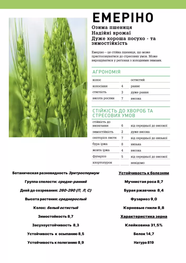 ЕМЕРІНО Озима пшениця Надійні врожаї Дуже хороша посухо - та зимостійкість