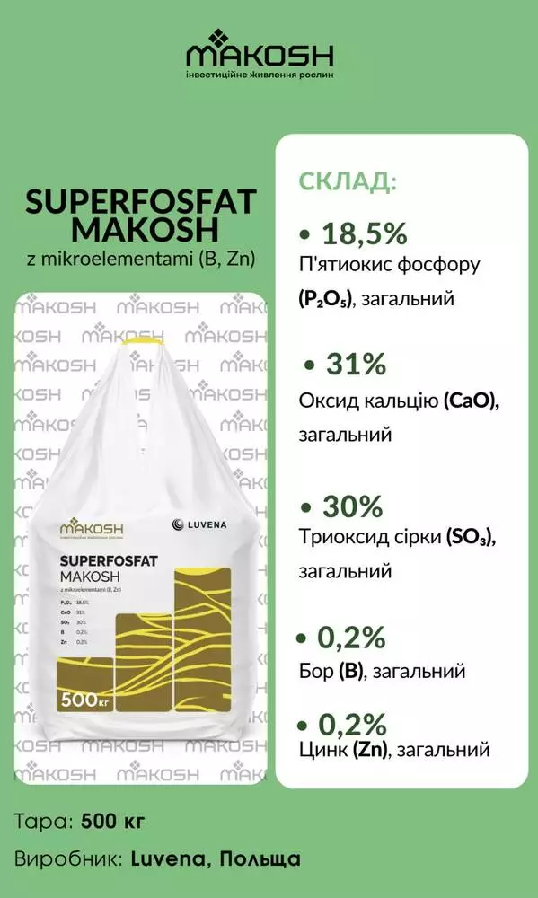 Суперфосфат - ефективне добриво з фосфором, азотом, сіркою, кальцієм у складі, збагачене бором, цинком, міддю, марганцем, залізом, молібденом.