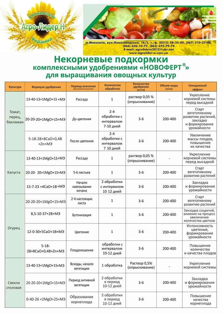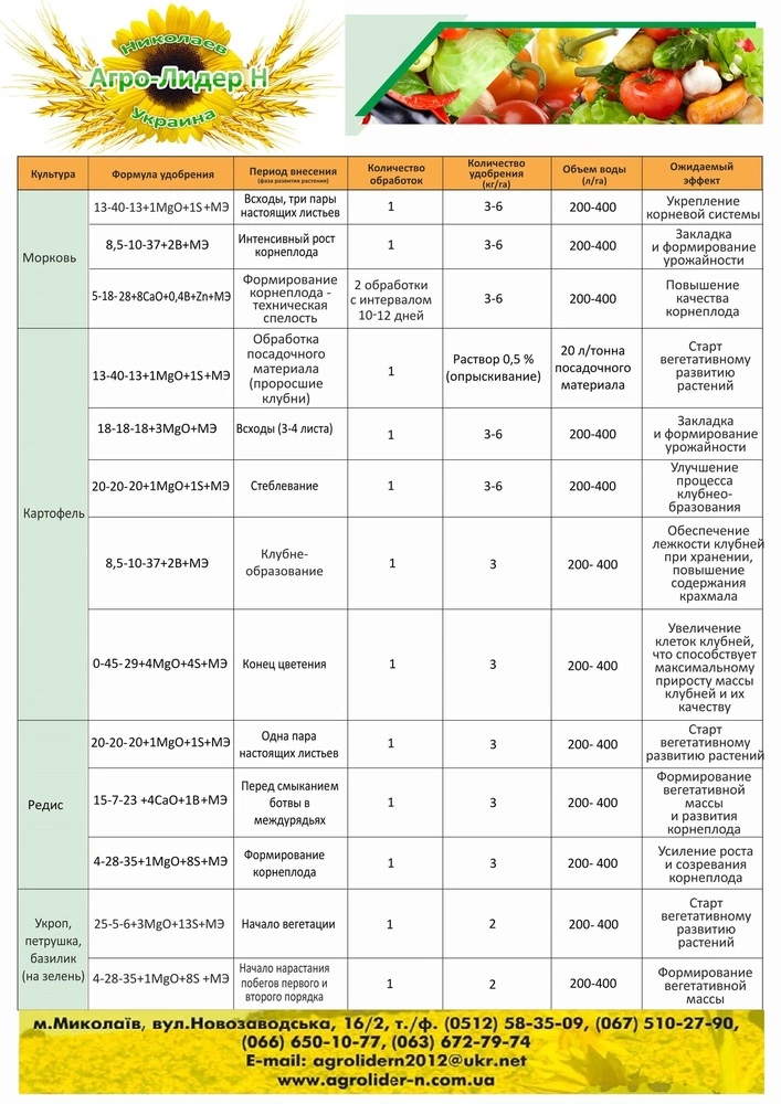 Водорозчинне добриво NPK з мікроелементами без хлорне, містить збалансований комплекс макроелементів (азот, фосфор, калій), мезоелементів (магній,сірку, кальцій) і мікроелементів (Cu, Fe, Mn, Zn ) на хелатній основі ЕДТА (етилендіамінтетраоцтової кислоти), а також бор і молібден